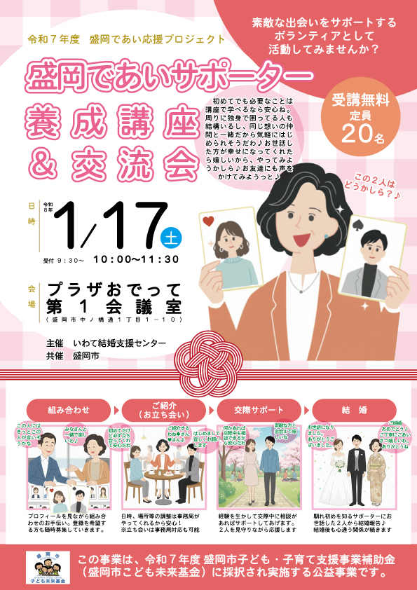 この制度の登録者に1対1の出会いを組み合わせするなど、出会いから結婚までを応援していただく「盛岡であいサポーター」さんを募集します。