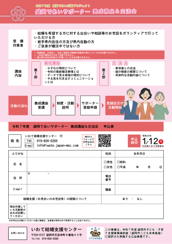 結婚を希望する独身者の御引合わせの組み合わせのお手伝い等、結婚支援活動を希望する方や、ご興味のある方は、「盛岡であいサポーター養成講座」を下記の日程で開催しますので、ぜひご参加ください。